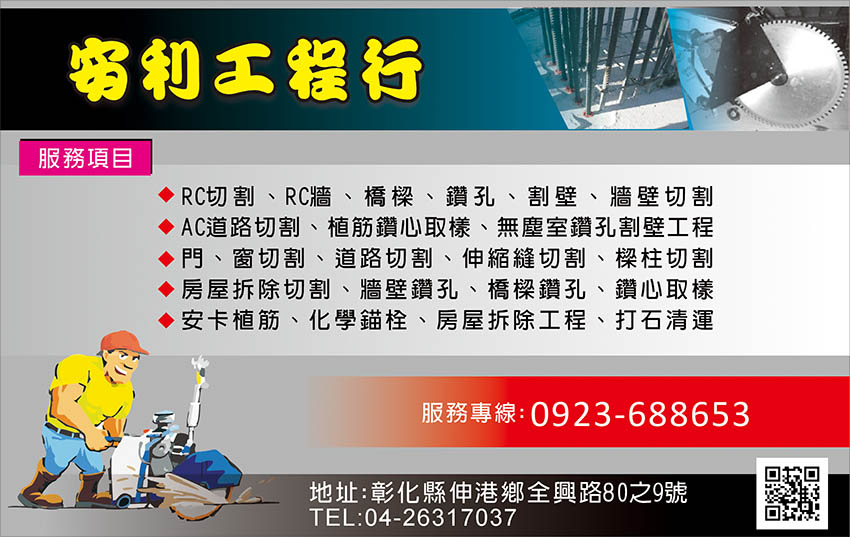 RC切割、RC牆、橋樑、鑽孔、割壁、牆壁切割、AC道路切割、植筋鑽心取樣、無塵室鑽孔割壁工程、門窗切割、道路切割、伸縮縫切割、樑柱切割、房屋拆除切割、牆壁鑽孔、橋樑鑽孔、鑽心取樣、安卡植筋、化學錨栓、房屋拆除工程、打石清運、建築物改修、電子廠房施工、無塵室施工、住家翻修改建、隔間拆除、房屋拆除工程、舊屋改建套房、消防鑽孔、水電鑽孔、空調鑽孔、大小工程承包、連續壁鑽孔、室內規劃設計、裝璜水電承包、室內裝璜拆除、地板開口切割、圾垃處理清運、拆除量多折數低、切割鑽孔、打石清運、水電鑽孔、RC牆、台中房屋拆除工程、台中RC牆、台中橋樑、台中鑽孔、RC、中部鑽孔切割