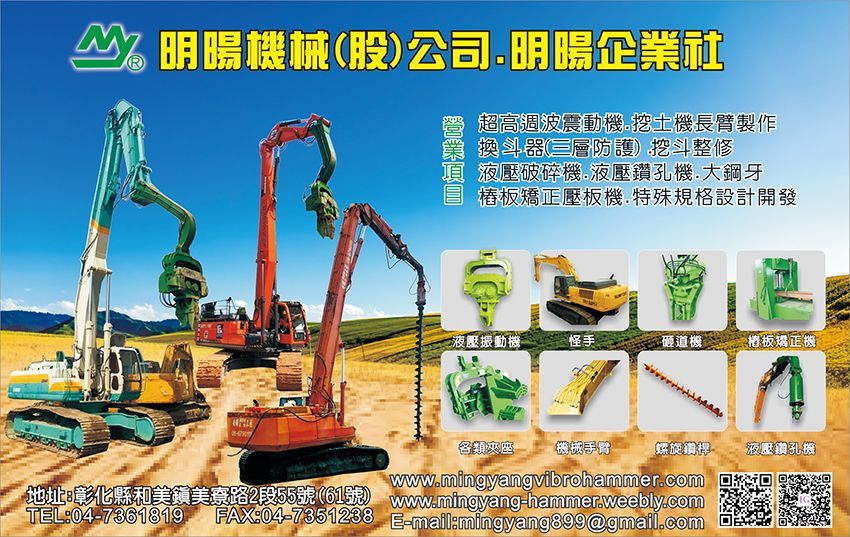 高頻液壓振動機、挖土機怪手、液壓破碎捶機、樁板矯正機、大鋼牙、砸道機 、二手機械、High Frequency Hydraulic Vibratory Hammers、Excavators、Hydraulic breakers、Sheet Pile Repairing Machine、Steel Teeth、Tie Temper、Used Machine