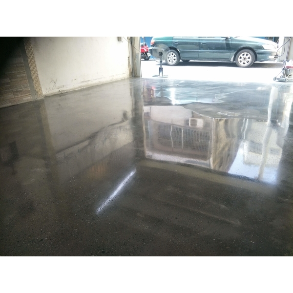- 車庫混凝土地板,年輕業主喜歡混凝土自然樸實的質感,又不希望使用後有起砂揚塵的問題!因此決定施作固化拋光地坪。