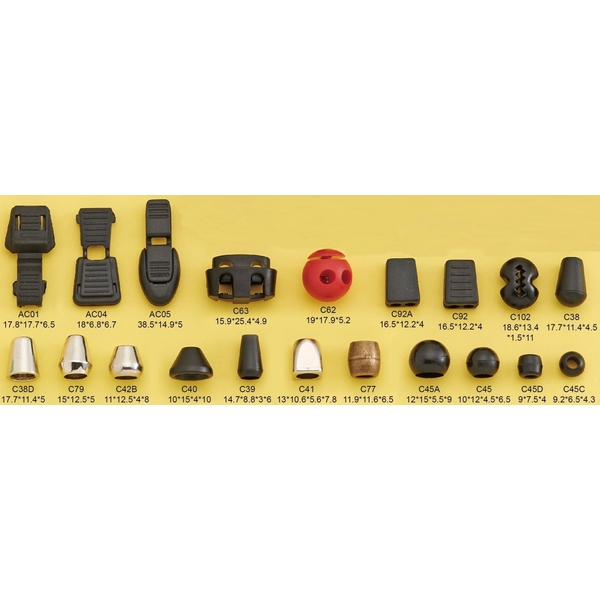 波麗鈕釦、塑膠電鍍扣、真貝鈕釦、椰子鈕釦、木釦、牛仔立釦、金屬鈕釦、四合扣、雞眼、水鑽扣、壓克力鈕釦及其它服飾配件