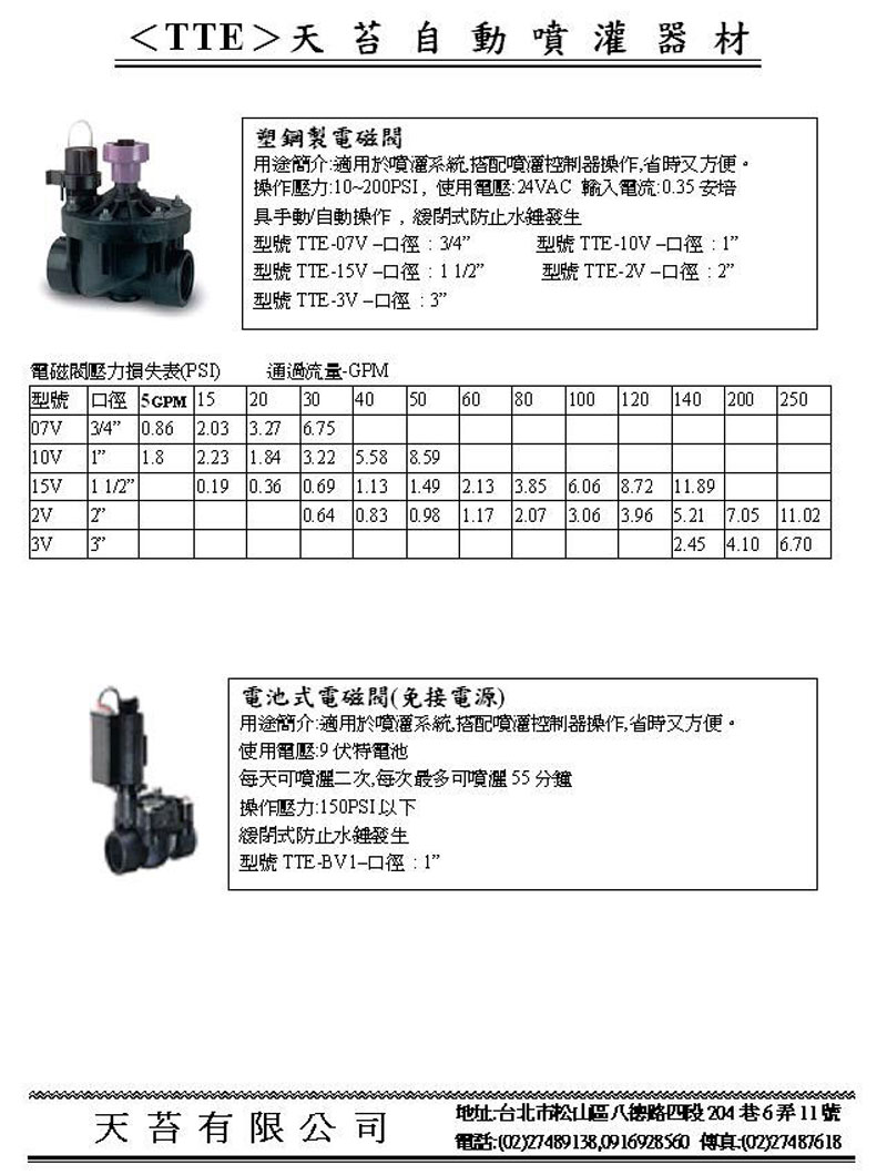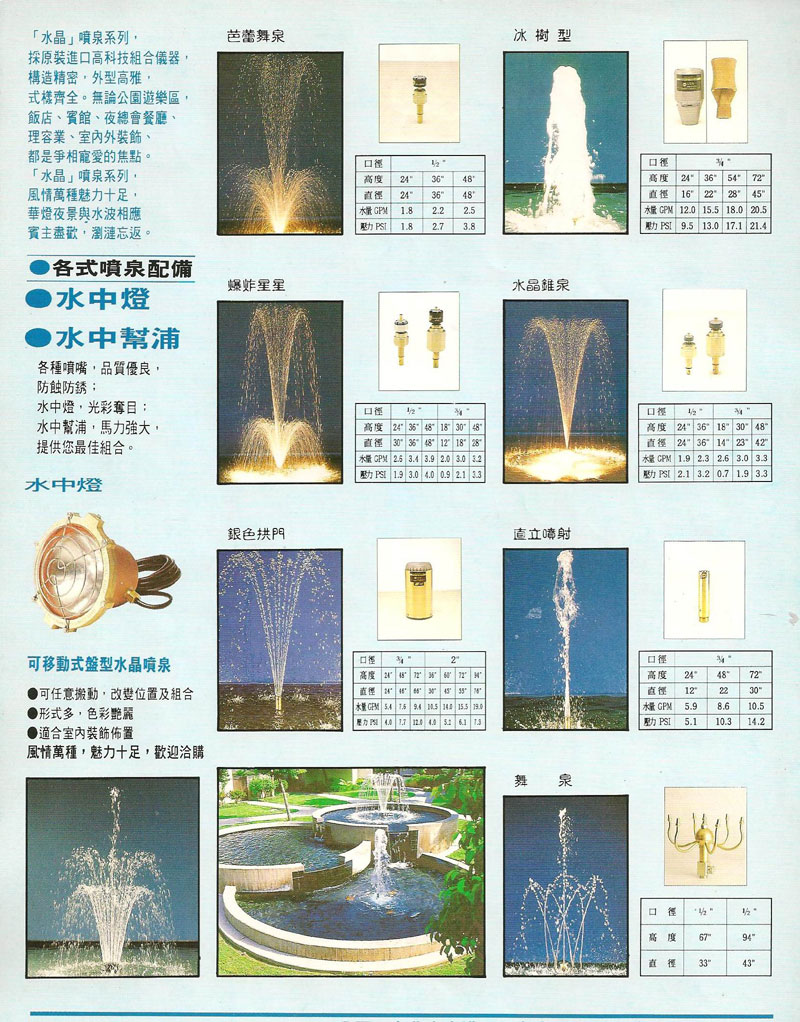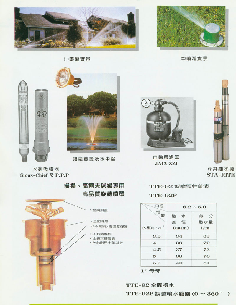 噴灌、滴灌、隱藏式噴頭、自動灌溉控制器、全自動噴灌控制器、無線晴雨控制器、游泳池系列器材、噴泉、小型噴泉-芭蕾舞泉、各式水中燈、噴泉實景及水中燈、小型氣象站、滴灌管、穩壓滴灌管、自動給水閥、銅製電磁閥、4分噴頭、6分噴頭、大型拍擊式噴頭、銅隱藏式小噴頭、大型噴泉-變化潮顏、塑鋼Y型過濾器(可加裝排污閥)、電池式電磁閥(免接電源)