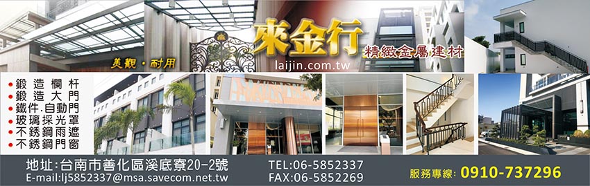 鍛造欄杆、鍛造鐵件、鍛造大門自動門、玻璃採光罩、不銹鋼雨遮、不銹鋼門窗、造型欄杆、藝術欄杆、採光罩、雨遮、格柵欄杆、鍛造大門、大門、鐵件工程、金屬建材、入口小門、金屬雨遮自動門、造型門牌、防盜窗、鑄花藝術欄杆、藝術鍛鐵窗、格柵、金屬工程、遮陽板、遮雨棚、金屬門窗、扶手、隔戶屏、玻璃框、活動小門、廟宇牌樓、台南鍛造欄杆、台南鍛造鐵件、台南玻璃採光罩、台南不銹鋼門窗、台南藝術欄杆、台南鐵件工程