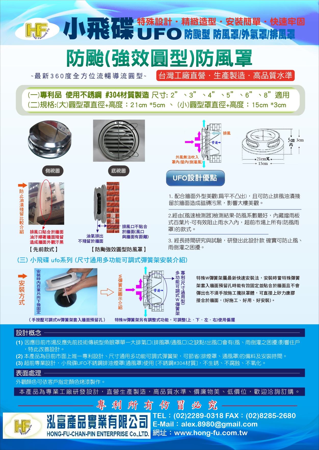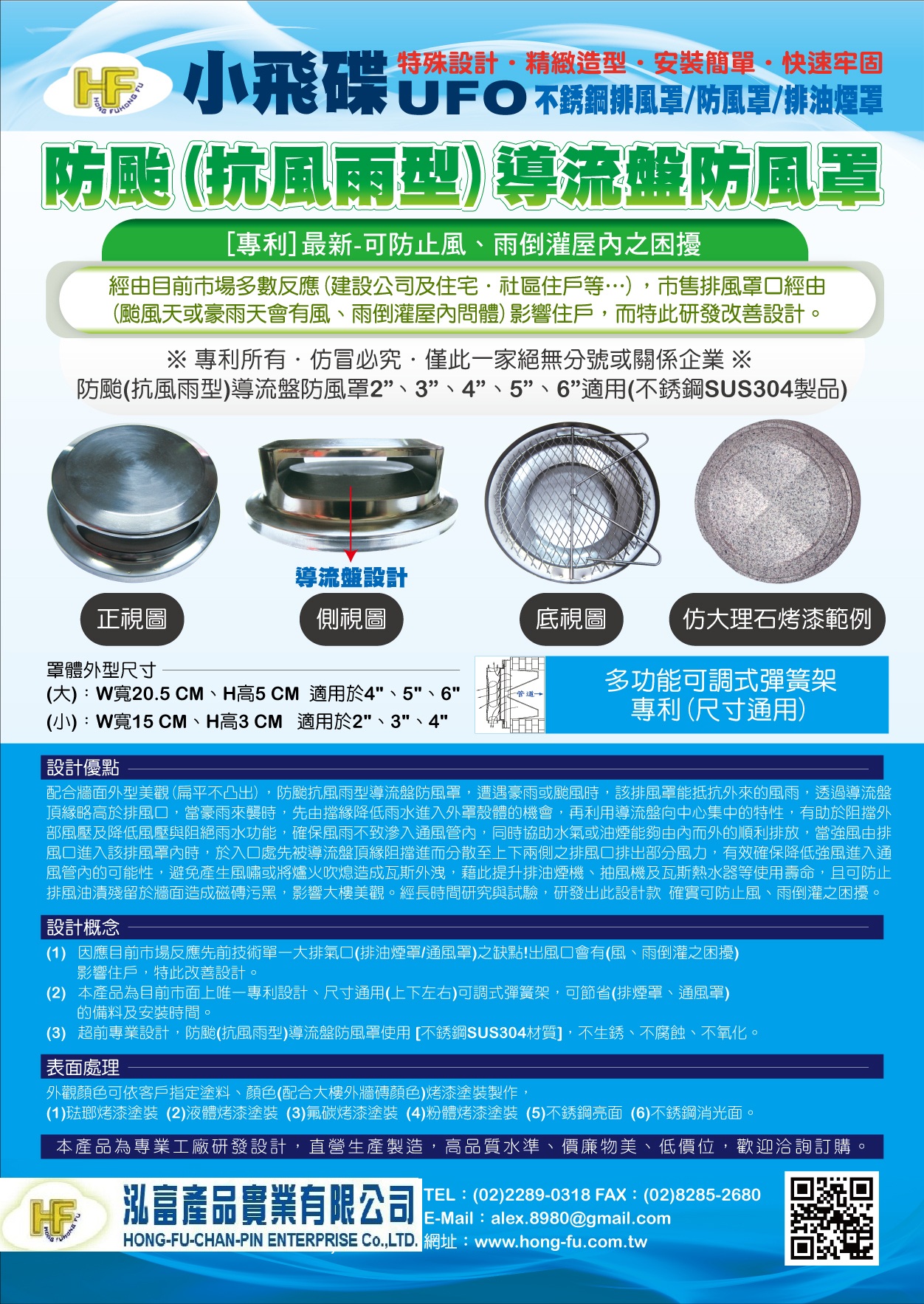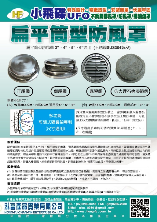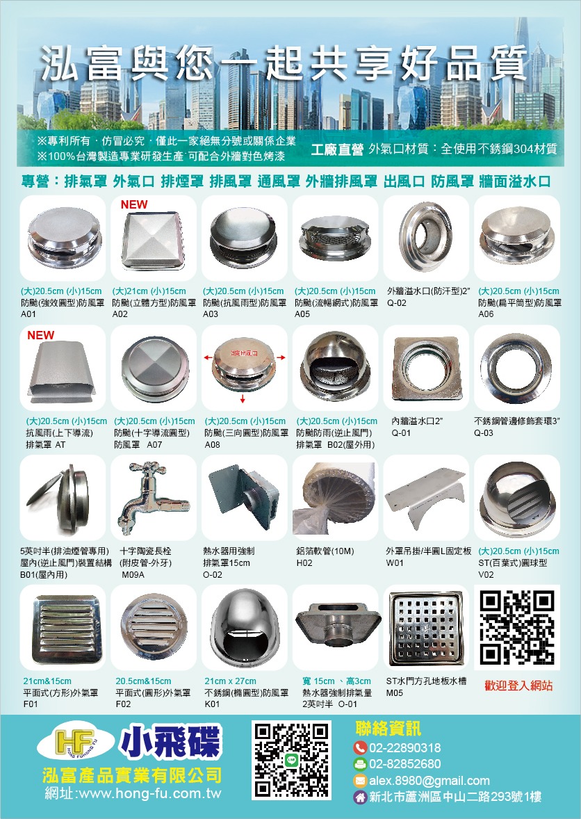 排氣罩、防風罩、排煙罩、方形外氣口、出風口、溢水口、防颱型、立方體、平面、衛浴通氣口、圓形、筒狀、魚眼罩、方形、排煙罩、外氣罩、排風罩、內牆溢水口、外牆溢水口、外牆排風罩、通風罩、不鏽鋼管邊修飾蓋、方形排風罩、 廁所排氣罩、通風口、扁平風罩、專利不銹鋼防風型排氣罩、四角形、逆止風門防風罩、防颱立體方型防風罩、熱水器強制排氣罩、防颱抗風雨型導流盤防風罩、鋁箔軟管、防颱強效圓型防風罩、鋁自由軟管、防颱導流盤防風罩、抗風雨型導流盤防風罩、收邊修飾套環、不銹鋼管邊修飾蓋、防颱3向圓型防風罩、抗風雨型防風罩、屋內逆止風門裝置結構、ST防颱型排煙罩、逆止風門排煙罩、流暢網式防風罩、衛浴室內出口罩、方形圓型衛浴室內出口罩、新北溢水口、新北外氣口、扁平筒型、衛浴室內出口罩、外牆排氣罩、不鏽鋼排油煙罩、橢圓型防風罩、不銹鋼平面方形外氣口、不銹鋼平面圓形外氣口、防風雨式排煙罩、逆止閥、不鏽鋼排煙罩、圓型逆止風門、牆面溢水口、溢水口修飾蓋、大樓管道間渦輪自然通風器、鋁自由管、鋁箔軟管、伸縮軟管、鋁軟管、不保溫軟管、水電五金器材、廚具爐具器材、衛浴設備器材、大樓對外排氣口、排油煙機鋁管、專業台灣製造大樓對外排風口產品、排氣罩裝置