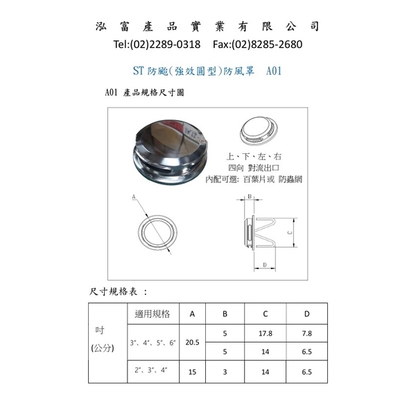 3.(小飛碟)主要產品不銹鋼: 排煙罩、防颱型防風罩、方形排風罩、外氣口、排氣罩、出風口、防風雨罩、溢水口、防颱型排氣罩、外牆排風罩、不銹鋼透氣罩VTR、熱水器強制排氣罩、排風罩、魚眼罩、通風口、排煙罩、鋁箔軟管、防雨罩、3向防風罩、排風口、防風罩、外氣罩、筒狀排氣口、內牆溢水口、逆止風門排風罩、溢水口修飾蓋、鋁自由管、外牆溢水口、收邊修飾套環、不銹鋼平面方形外氣口、逆止閥、不鏽鋼平面圓形外氣口、外牆排氣罩、廚房排風罩、排油煙機專用逆止風門.....固定使用不銹鋼304材質、不生銹、不腐蝕、不氧化,歡迎測試比較,專業台灣製造、大樓對外排風口產品、排氣罩裝置,也承蒙業界 及 知名建商指定使用--- 歡迎 ˙ 多多指教~感謝業界支持!!