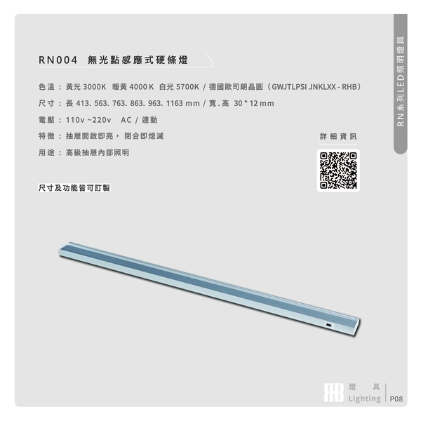 RN004 讓您的櫥櫃照明從**「功能性」進化到「美學與智慧」**。它不僅點亮了空間,更提升了您生活的品質。