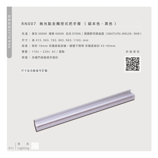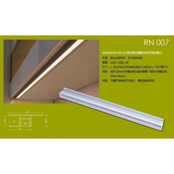 RN007 觸控把手燈, 手掃/常亮二合一, 櫥櫃照明, 德國OSRAM晶片型號 : RN007