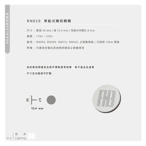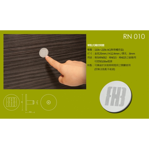 RN010 迷你單點觸控開關,直徑僅 25mm,完美隱藏於木作表面。支援 110V-220V 高壓電,可作為 RN002、RN009 等多款燈具的啟動按鈕,控制 100W 內燈源。公司 : 博麗貿易有限公司