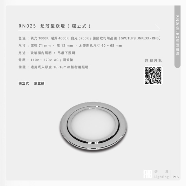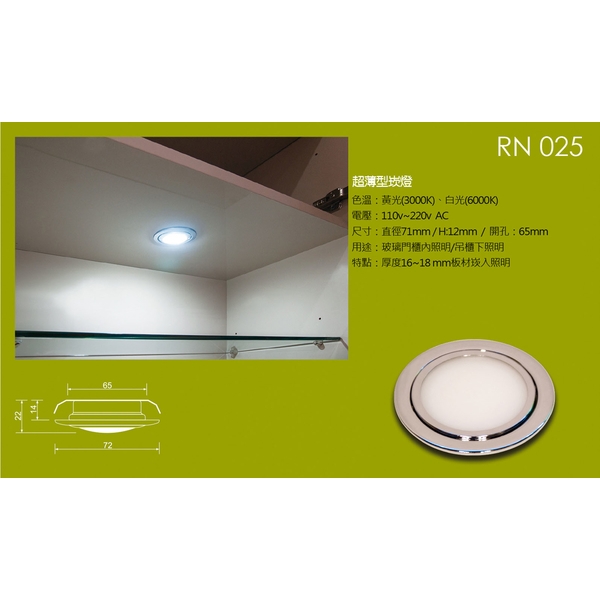 RN025 超薄圓形崁燈,高度僅 12mm,完美適用 16-18mm 厚度板材。110V-220V 高壓直入(免變壓器),搭載德國歐司朗晶圓。是玻璃櫃內、吊櫃下照明的理想獨立式崁燈。公司 : 博麗貿易有限公司